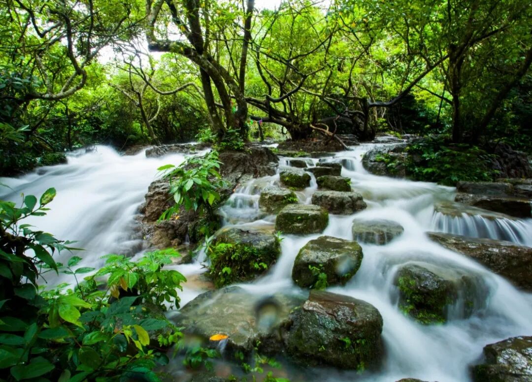 清澈见底的溪水在石头和树根间潺潺流淌