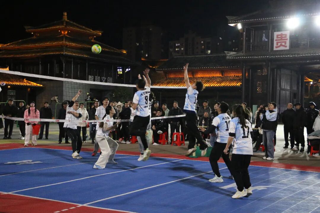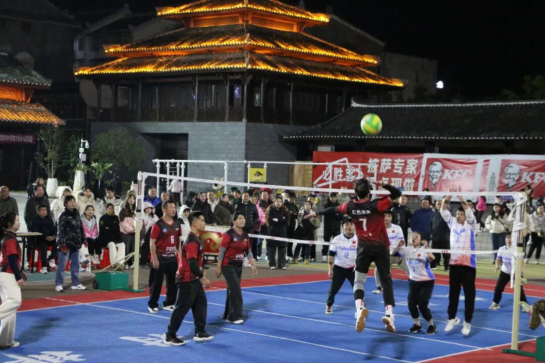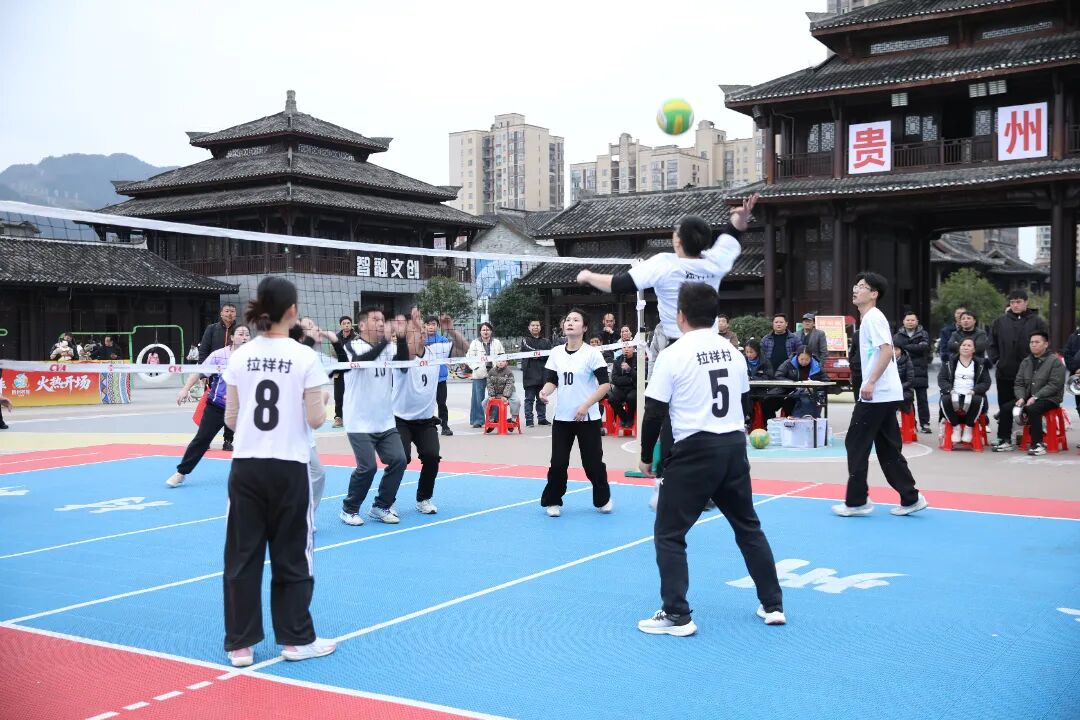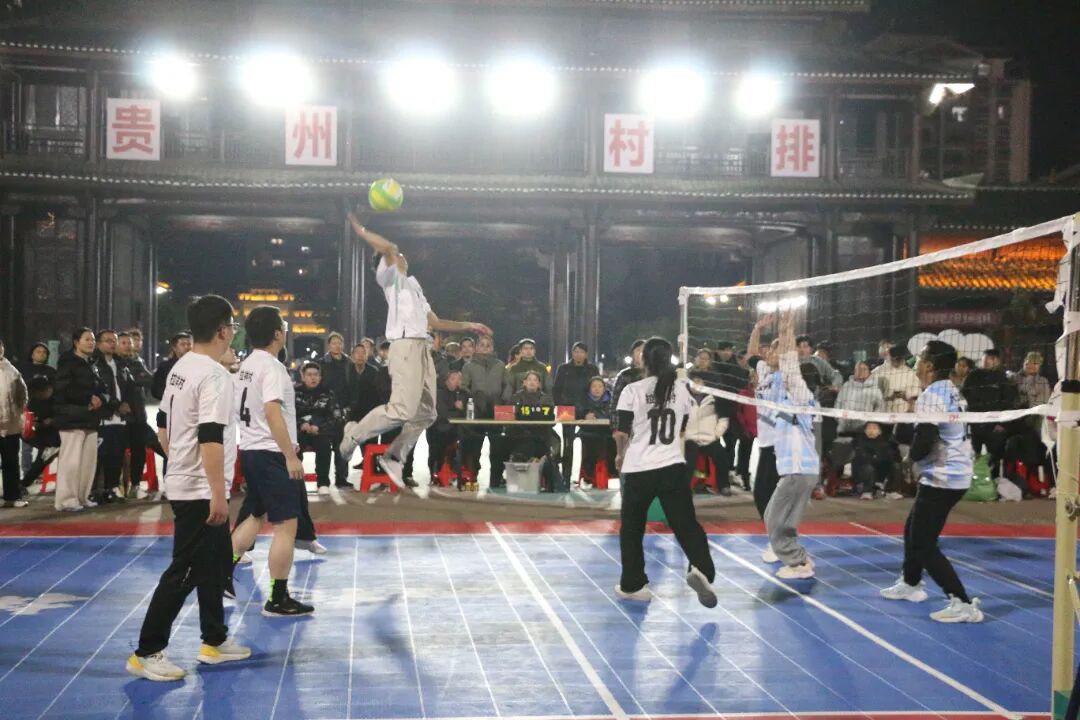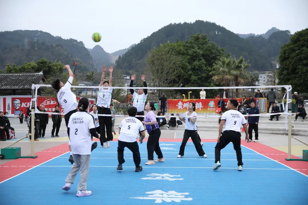 午后阳光正好,赛场暖意融融。来自全县各村寨的队员们身着简易队服,精神抖擞地踏上赛场,传球时的默契配合、拦网时的奋力起跳、扣杀时的干脆利落、救球时的拼尽全力,每一个动作都透着对这项运动的执着。场边观众席早已座无虚席,村民们搬着小板凳结伴而来,游客们举着手机记录精彩瞬间,每当赛场出现亮眼表现,欢呼声便此起彼伏,连路过的行人都忍不住驻足加入这场全民狂欢。